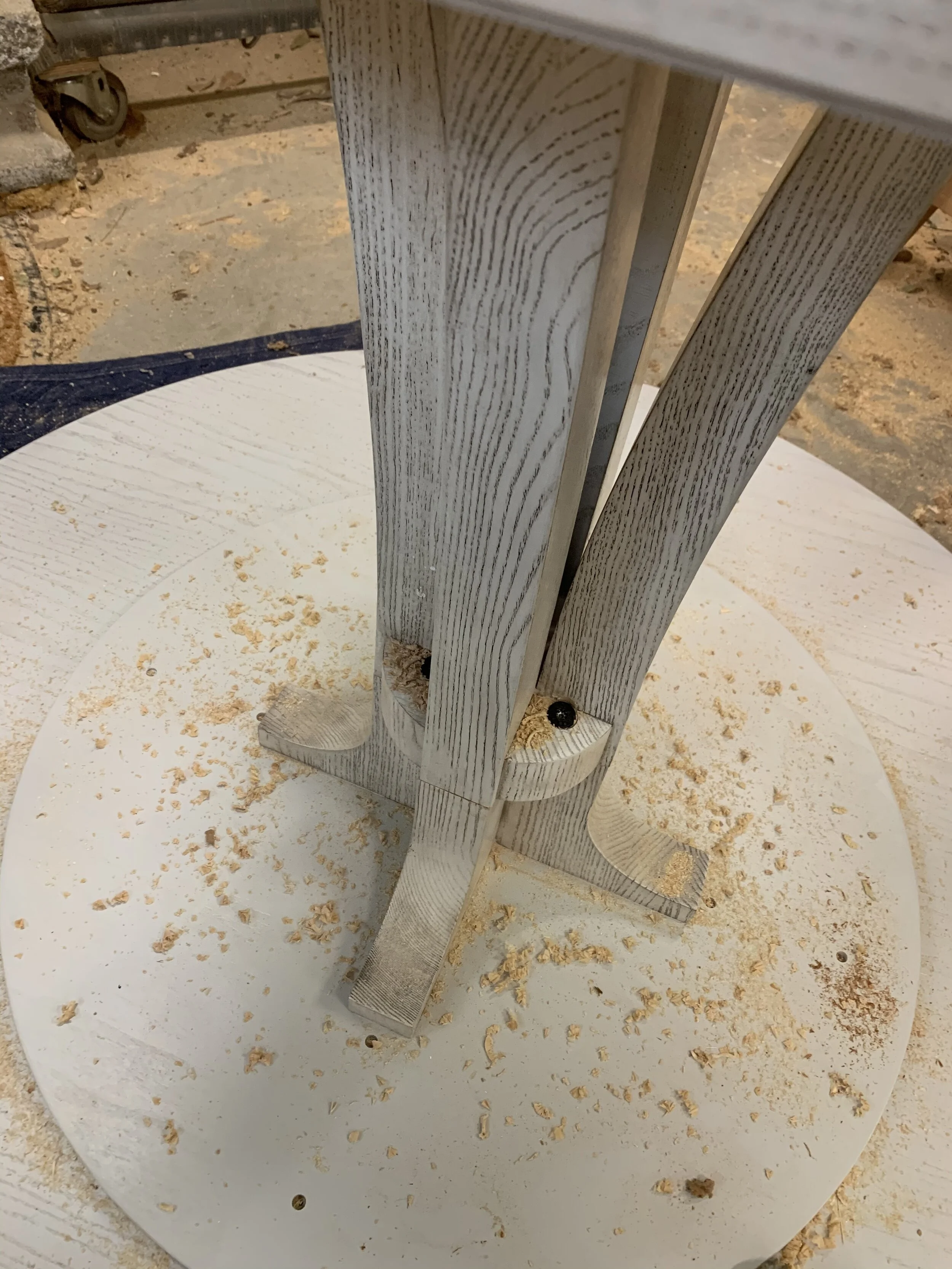 We called our trusted artisan friend Mitch Mitton with Mitton Theme Design to come to our rescue which he quickly did (again the power of relationships). We decided to cut the table down several inches. While the table was in his shop, he also put grommet holes in the table to we can have better wire management (refer to Week #1 Blog to see our previous aesthetic nightmare).